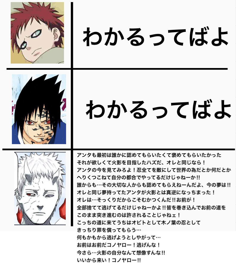 そもそも口に出さないだけで深層心理と向き合う滝のとこだと手のひら返す木の葉の里の奴らもちゃんと恨んでるし、サスケみたいに闇堕ちしてたかもしれないって自分で認識した上であの行動やからな