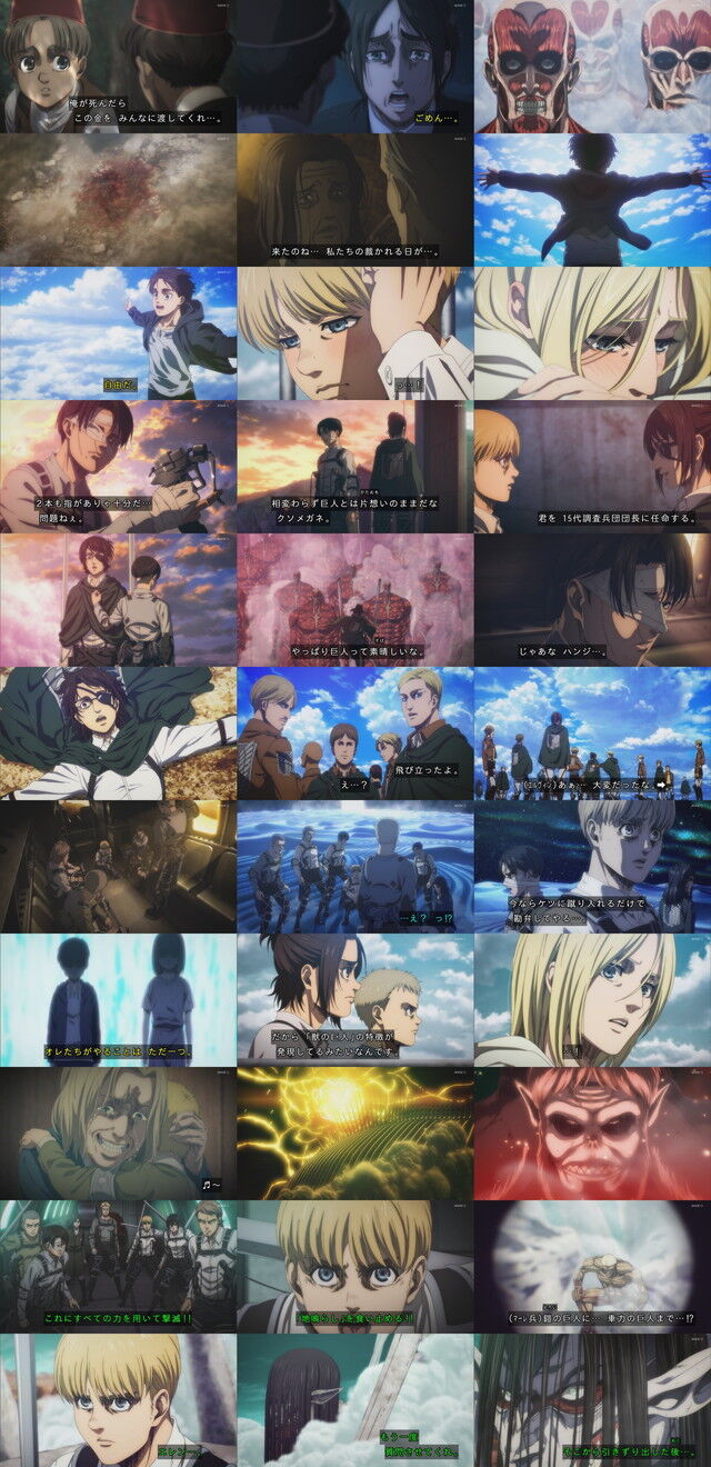 地ならしの車奪うとことか自殺する者が居るところなんかのオリジナルシーンはとても良かった車窓の景色とかも良かったアニとアルミンの微細な気持ちの動きようとかも凄く良かった。人物描写はやっぱさすがだと思ったアニが船に乗り込むシーンの左手一本で階段上がってくシーンなんかも疲労してる感が伝わってきてて凄く良かった改心する前のライナーの母親のゲス顔も良かった飛行船舞台vsジークもドラゴンボール見てんのかってくらい迫力抜群で見応えがあった音楽も良かった